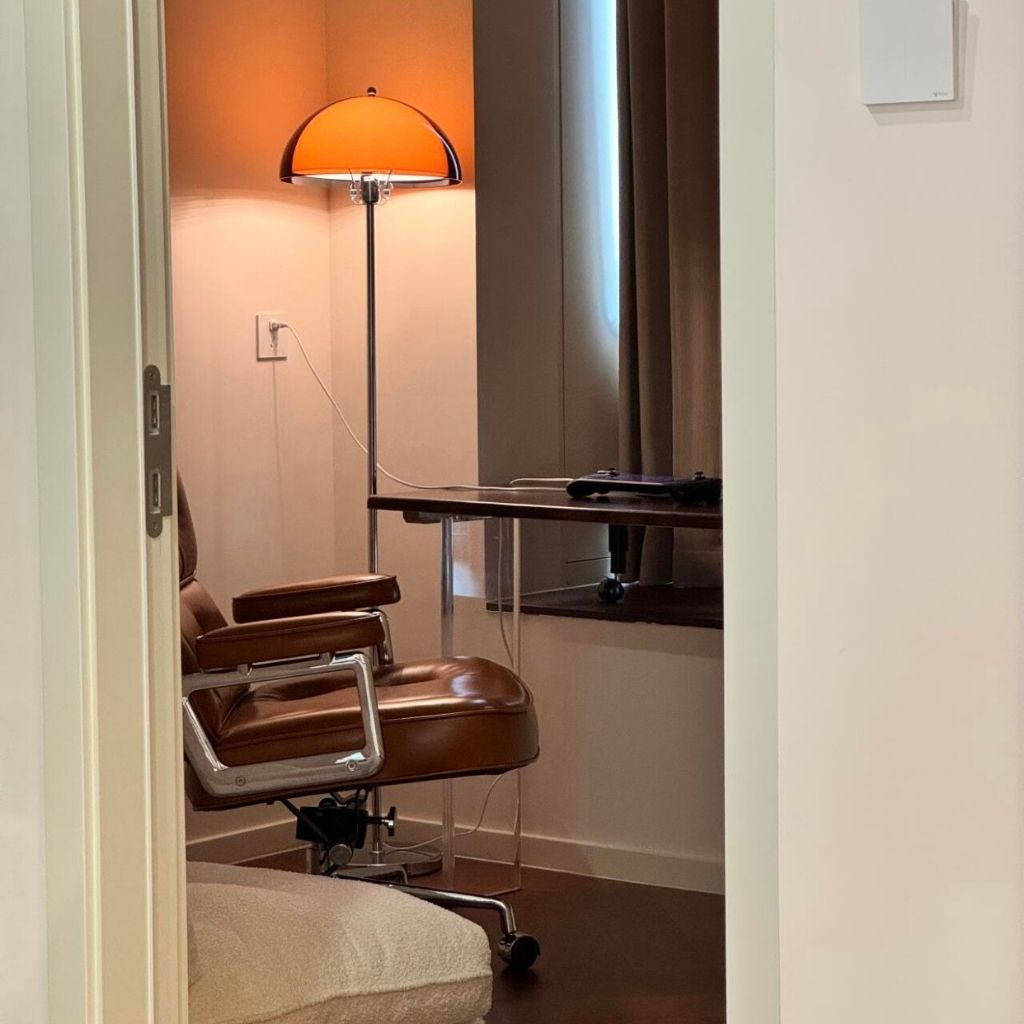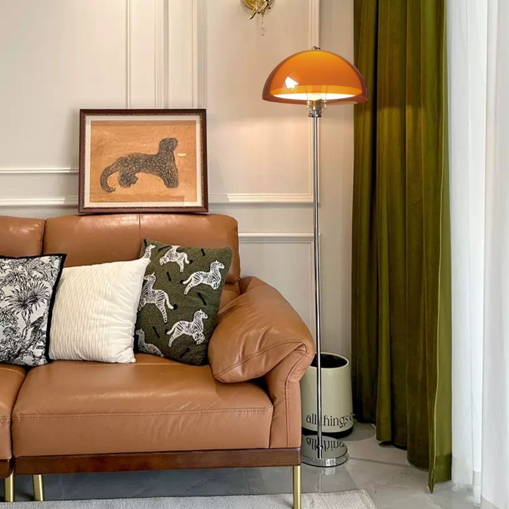 Để lan tỏa hơi ấm màu cam lên toàn bộ không gian, Đèn Sàn Dome là lựa chọn không thể bỏ qua. Chiếc đèn cao này giữ nguyên sự đối lập vật liệu kinh điển: chao đèn bán cầu lớn bằng acrylic màu cam trong suốt đặt trên thân và đế chrome mảnh dẻ. Sự kết hợp giữa hình học đơn giản và chiều cao ấn tượng giúp chiếc đèn này trở thành một chi tiết kiến trúc bổ sung. Nó không chỉ cung cấp ánh sáng nền ấm áp cho góc phòng khách hay khu vực đọc sách, mà còn định hình không gian theo chiều dọc một cách hiệu quả và thanh lịch.