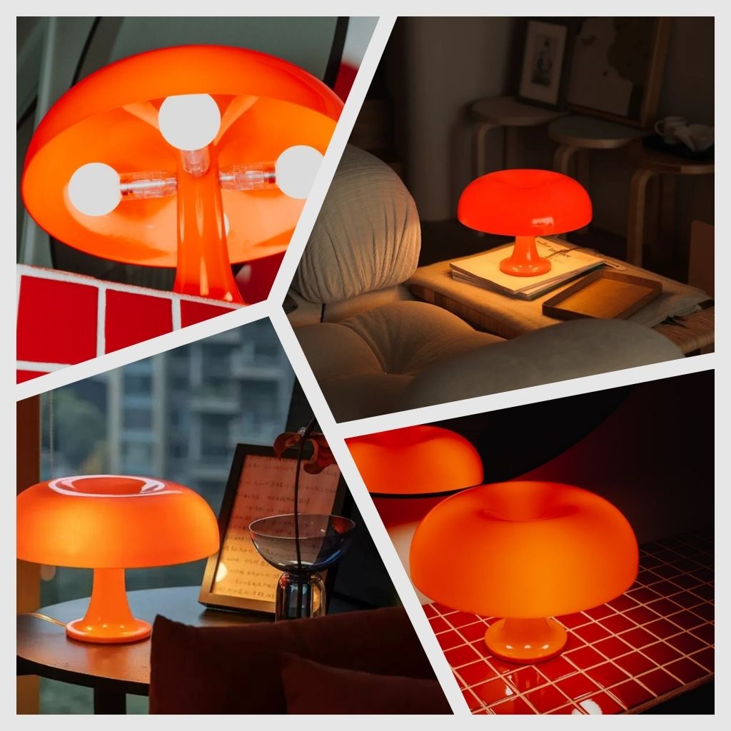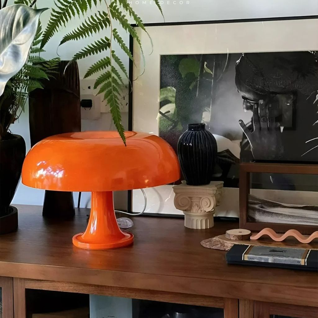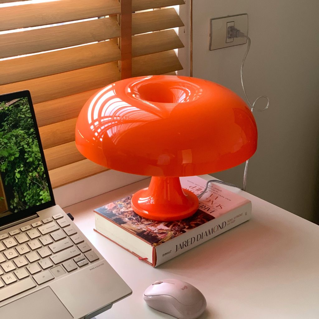 Bắt đầu với một tác phẩm kinh điển: Đèn Nesso (lấy cảm hứng từ thiết kế huyền thoại của Artemide). Chiếc đèn này không đơn thuần là một vật chiếu sáng mà là một tuyên ngôn nghệ thuật. Với hình dáng cây nấm khổng lồ, được chế tác từ vật liệu tổng hợp màu cam bóng bẩy, Nesso là đỉnh cao của phong cách Pop Art thập niên 60. Chao đèn lớn, hình vòm không chỉ giúp ánh sáng khuếch tán xuống bề mặt một cách đồng đều, ấm áp, mà còn biến chiếc đèn thành một tác phẩm điêu khắc ấn tượng trên bất kỳ tủ phụ hay bàn làm việc lớn nào, gợi lên tinh thần lạc quan và sự khám phá vũ trụ của thời đại đó.