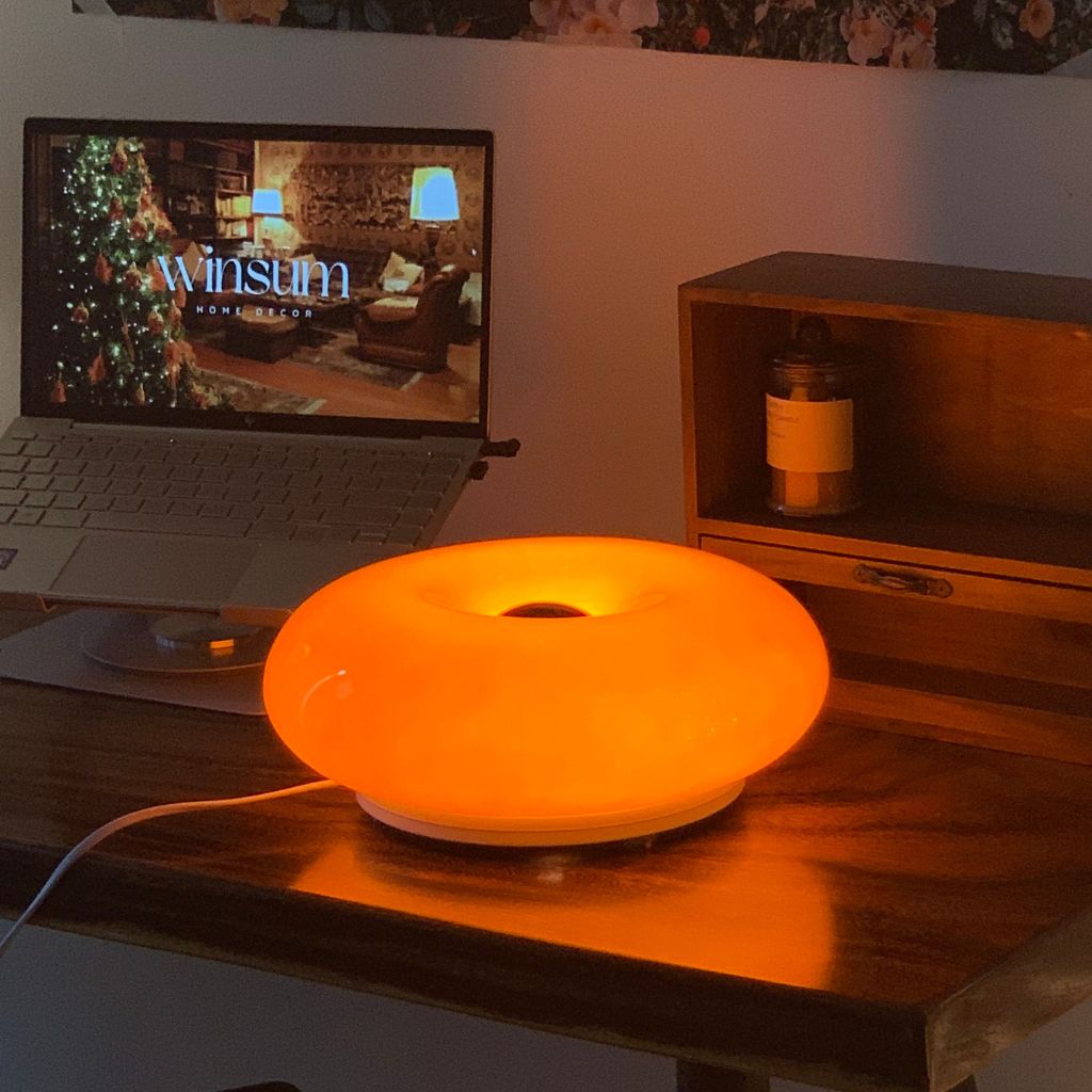 Nếu bạn đang tìm kiếm một món đồ nhỏ nhắn nhưng có sức ảnh hưởng lớn, Đèn Bàn Donut là câu trả lời. Chiếc đèn này ngay lập tức mang lại niềm vui với hình dáng tròn trịa, béo ú, được làm từ thủy tinh hoặc vật liệu bóng với màu cam rực rỡ. Đây là một món đồ trang trí thuần túy, là một nét chấm phá Pop Art vui nhộn. Với kích thước nhỏ, nó lý tưởng để đặt trên kệ sách, bệ cửa sổ hoặc bàn đầu giường, tạo nên một "điểm nhấn Dopamine Decor" đáng yêu và trẻ trung.