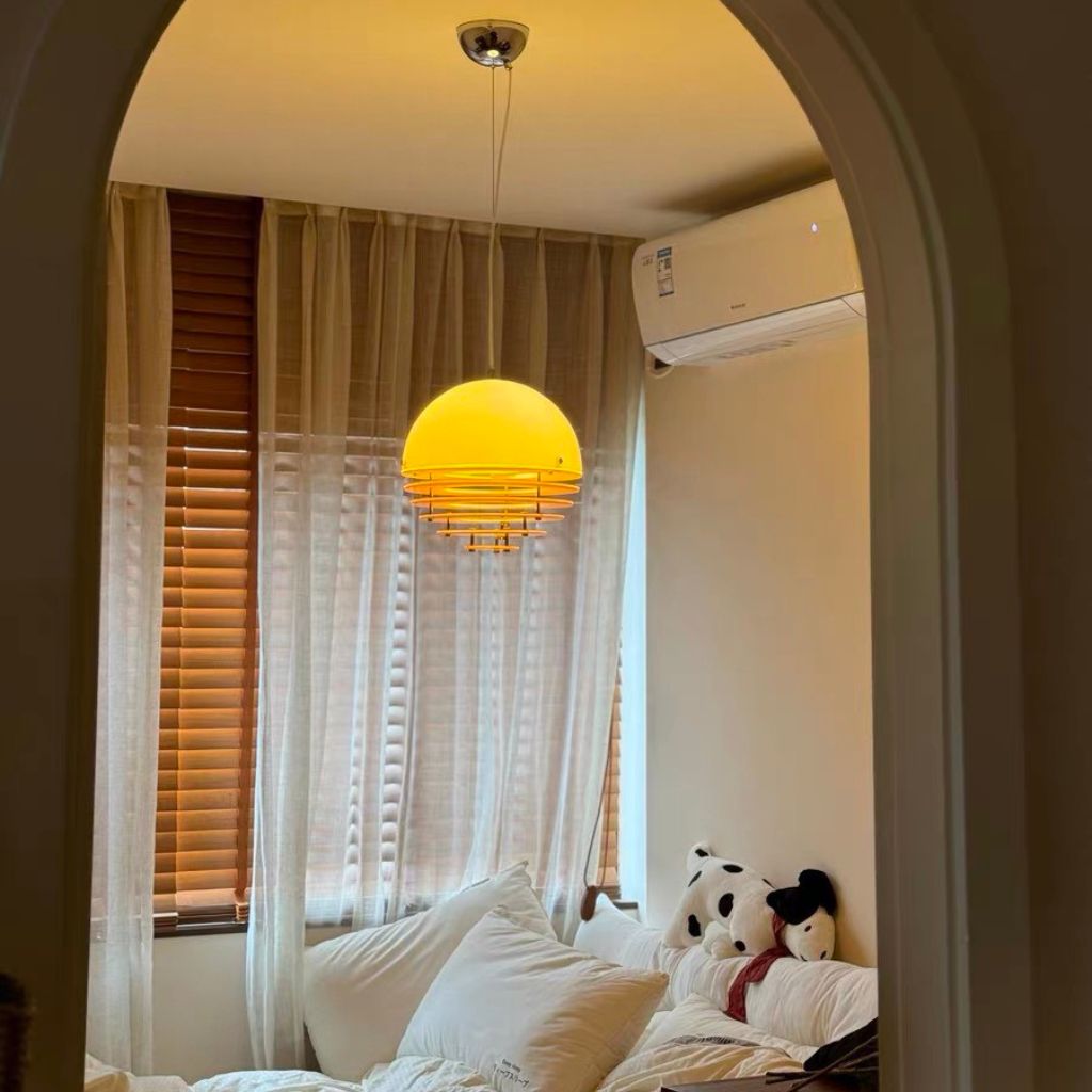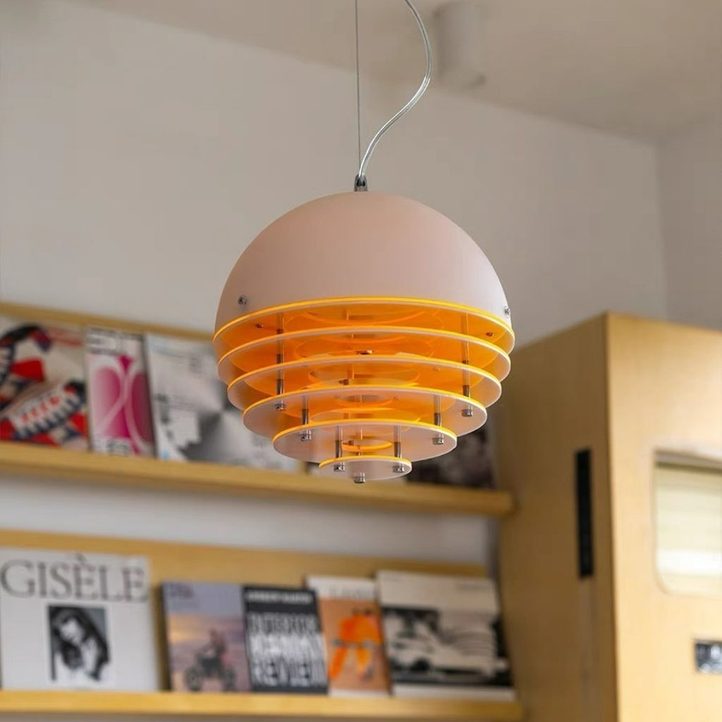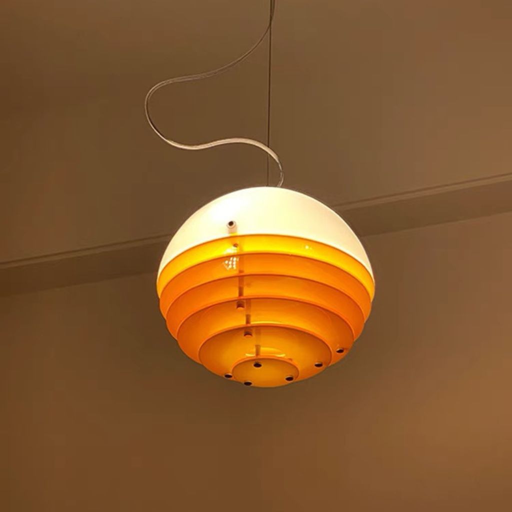 Hoàn thiện bộ sưu tập là Đèn Thả Sunset, một tác phẩm nghệ thuật phức tạp gợi nhớ đến những thiết kế đèn phân tầng của thập niên 70. Cấu trúc đèn bao gồm nhiều vòng đĩa đồng tâm bằng nhựa hoặc acrylic, tạo hiệu ứng chuyển màu tinh tế từ vàng sang cam đậm, mô phỏng lại cảnh hoàng hôn rực rỡ. Thiết kế phân tầng này không chỉ đẹp mắt mà còn có chức năng khuếch tán ánh sáng, loại bỏ độ chói và tạo ra ánh sáng nền mềm mại, có chiều sâu. Đây là tâm điểm hoàn hảo cho bàn ăn hoặc khu vực sinh hoạt chung, nơi ánh sáng cần phải ấm áp, mời gọi và mang tính điêu khắc cao.