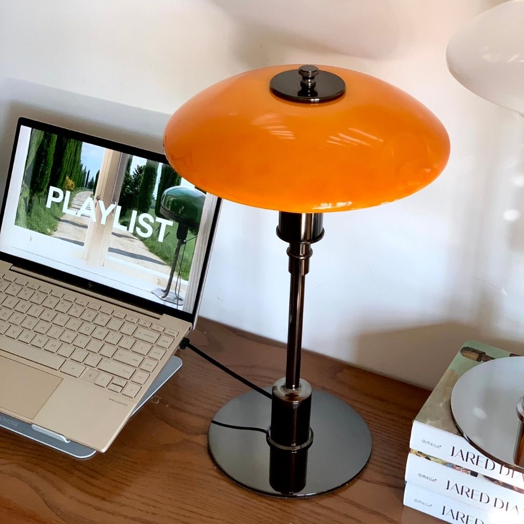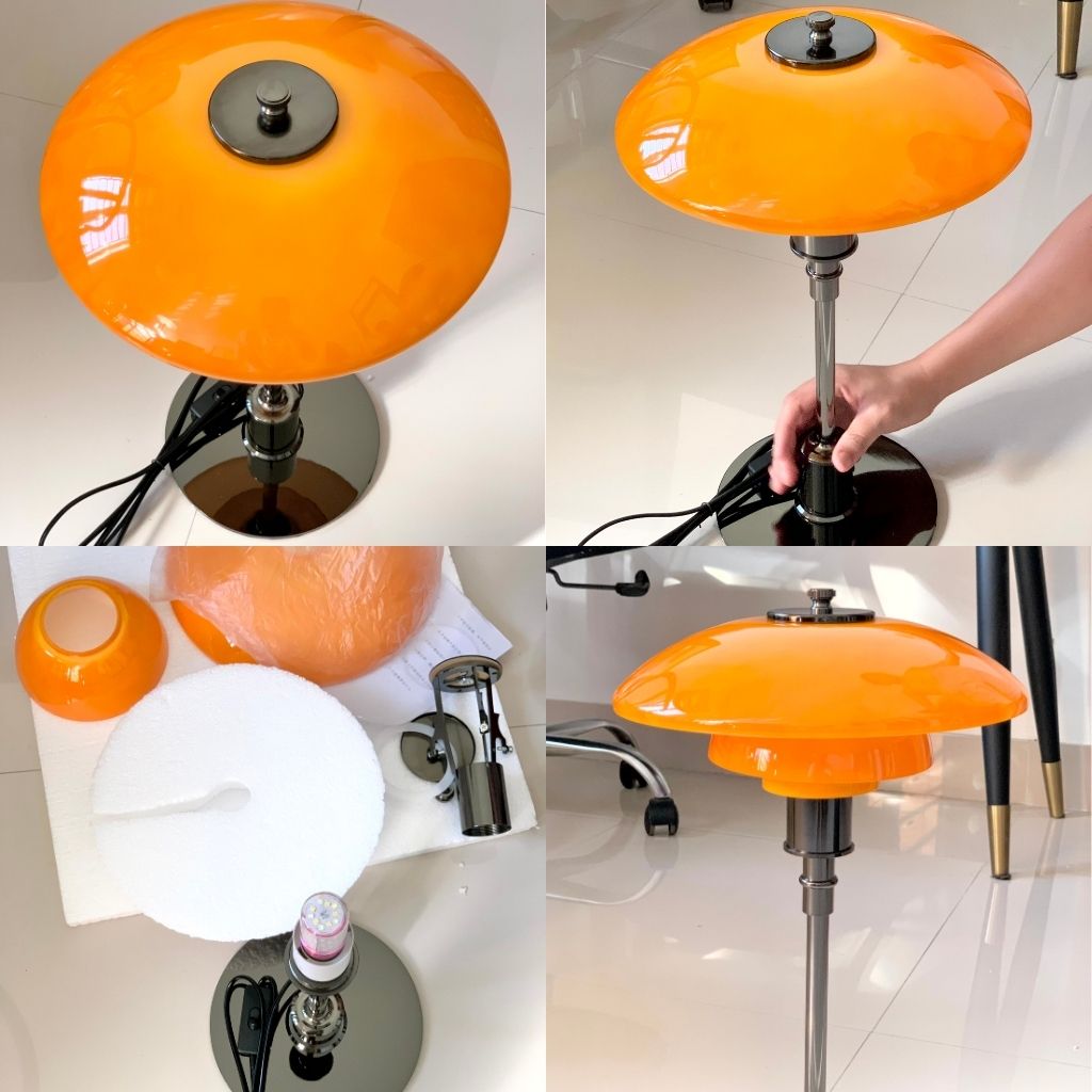 Ngược lại với sự phô trương của Nesso, chiếc đèn bàn lấy cảm hứng từ Louis Poulsen lại mang đến vẻ đẹp tối giản và thanh lịch của thiết kế Scandinavian. Đặc trưng là chao đèn hình đĩa dẹt, màu cam hổ phách ấm áp được nâng đỡ bởi thân trụ và chân đế kim loại mạ chrome sáng loáng. Sự tương phản này—giữa màu cam hữu cơ và kim loại công nghiệp—tạo nên sự cuốn hút tinh tế. Thiết kế này đặc biệt lý tưởng cho những người cần một nguồn sáng tập trung nhưng vẫn ấm áp, hoàn hảo để đặt cạnh laptop hoặc làm đèn đọc sách trong không gian Mid-Century hiện đại.
