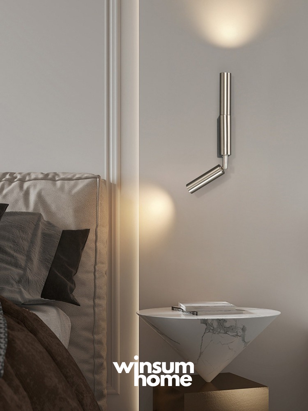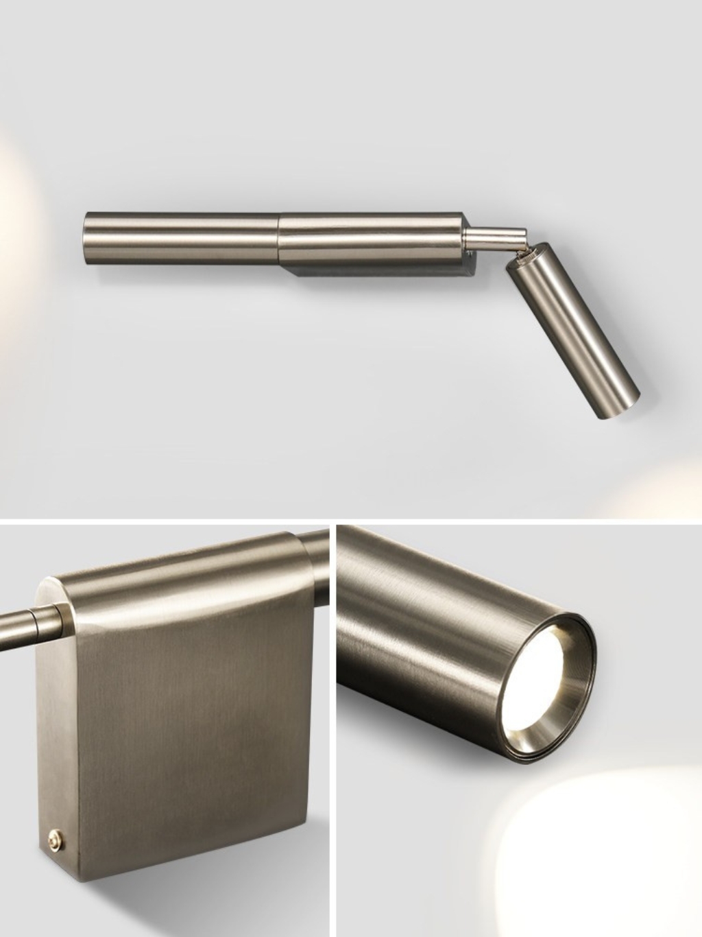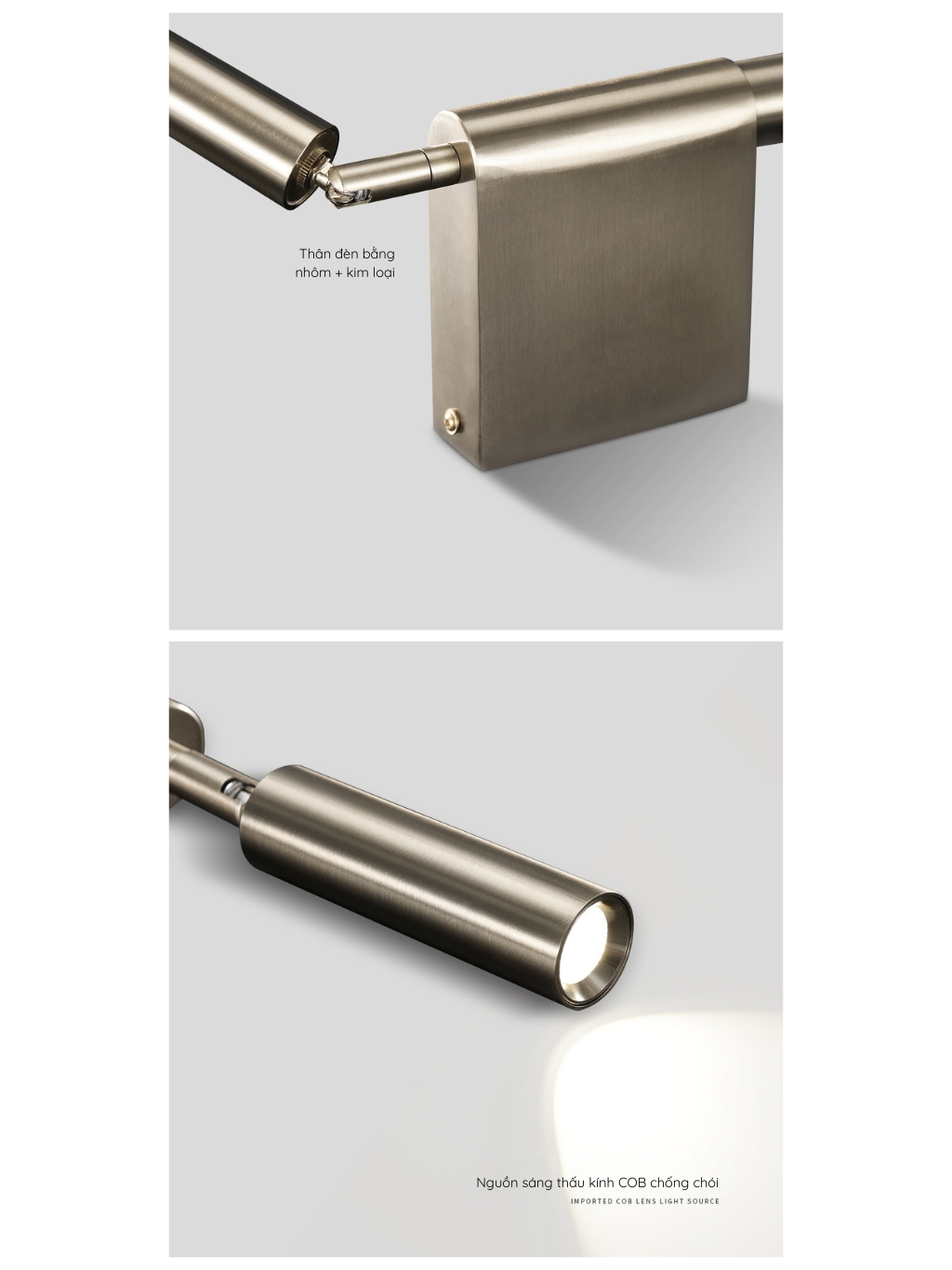 Đèn gắn tường thiết kế hiện đại, kiểu dáng thanh mảnh, có thể điều chỉnh hướng chiếu linh hoạt. Ánh sáng LED tập trung, phù hợp đọc sách, đầu giường hoặc chiếu điểm trang trí. Tông màu kim loại sang trọng, dễ phối nhiều không gian.