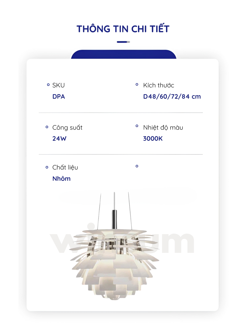 - Kích thước: 38cm / 48cm / 60cm / 72cm