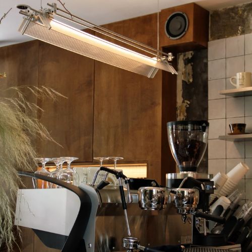Khi được treo tại quầy bar hoặc khu vực bàn cộng đồng của quán cà phê, chiếc đèn này ngay lập tức trở thành một điểm nhấn thị giác độc đáo, thu hút mọi ánh nhìn. Thay vì sử dụng đèn trang trí cầu kỳ, các chủ quán cà phê có thể tận dụng thiết kế "công nghiệp hóa" của chiếc đèn này để tạo nên một cảm giác thô mộc, mạnh mẽ và chân thực, phù hợp với xu hướng nội thất đang thịnh hành.