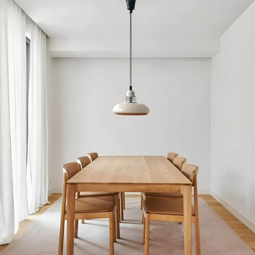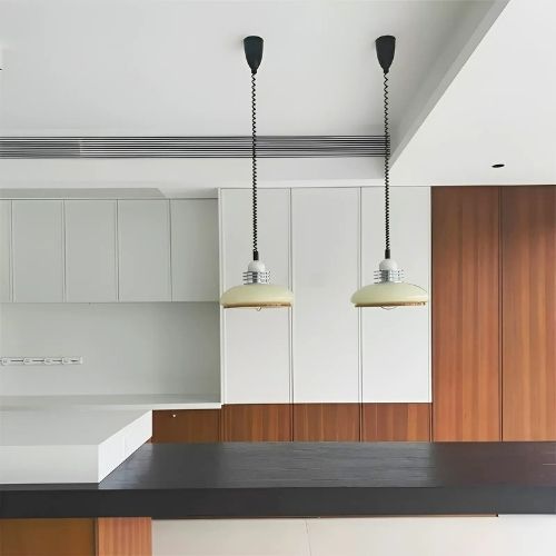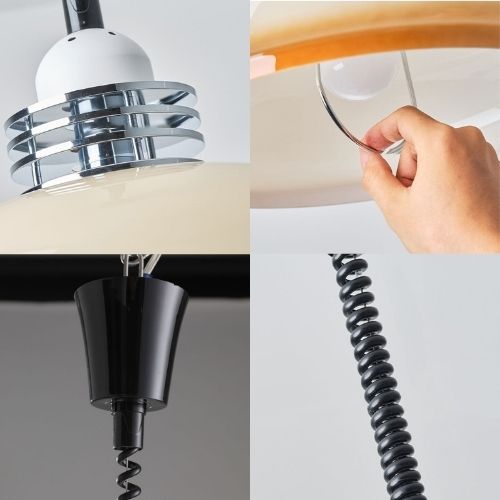 Bộ phận giữ chao đèn và gắn với dây treo được thiết kế với các chi tiết kim loại có rãnh màu trắng bạc, tạo ra một sự tương phản thú vị, mang hơi hướng công nghiệp hoặc tối giản. Chi tiết này không chỉ đóng vai trò kỹ thuật mà còn tăng thêm tính thẩm mỹ hiện đại, làm nổi bật cấu trúc tổng thể của chiếc đèn. Đặc biệt, dây điện màu đen được thiết kế dạng xoắn lò xo là một chi tiết nhỏ nhưng vô cùng đặc trưng, không chỉ giúp dễ dàng điều chỉnh độ dài mà còn tăng thêm vẻ cá tính và năng động cho tổng thể, thoát khỏi sự nhàm chán của dây treo thẳng thông thường.