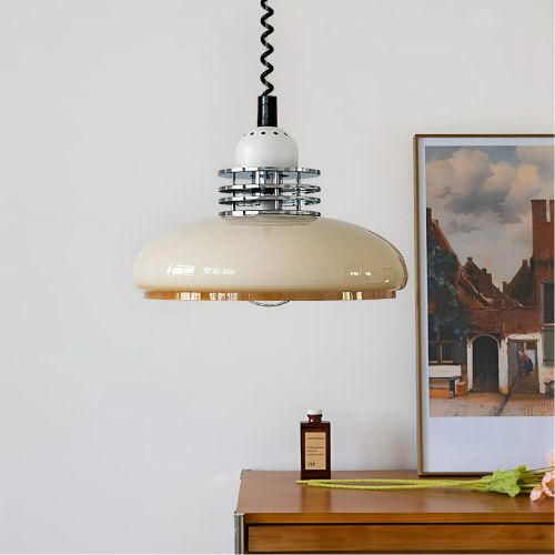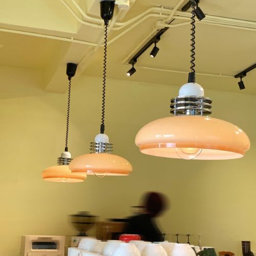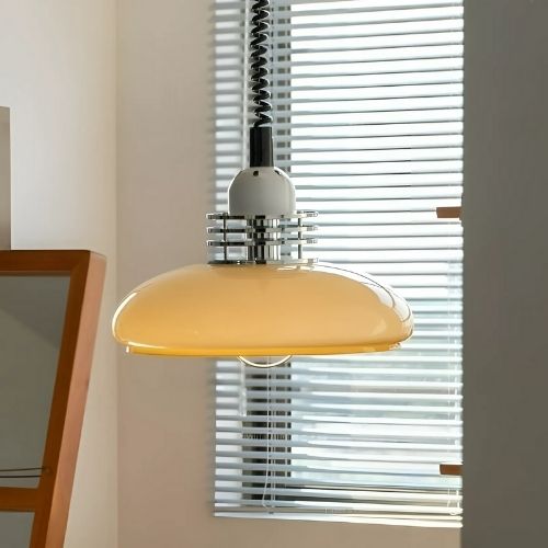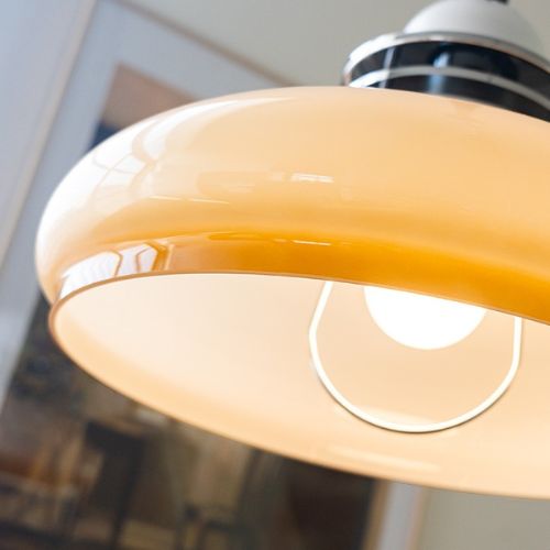 Thiết kế độc đáo là điểm mạnh lớn nhất của chiếc đèn này, bắt đầu từ chao đèn hình đĩa/bát nông với đường kính rộng. Phần chao đèn này được chế tác từ chất liệu mang lại cảm giác của thủy tinh hoặc nhựa cao cấp, sở hữu độ bóng mượt mà. Trong bức ảnh cận cảnh, chao đèn màu vàng hổ phách/cam nhạt toát lên vẻ ấm cúng, cổ điển, gợi nhớ sâu sắc đến phong cách Mid-Century Modern (Giữa thế kỷ XX) hoặc Retro đầy hoài niệm. Trong khi đó, ở các hình ảnh tổng thể phía dưới, chao đèn màu trắng kem/be lại mang đến sự thanh lịch, nhẹ nhàng và dễ dàng hòa hợp với nhiều phong cách nội thất hơn, từ tối giản đến Scandinavian.