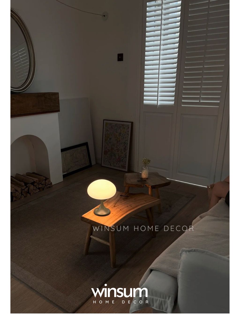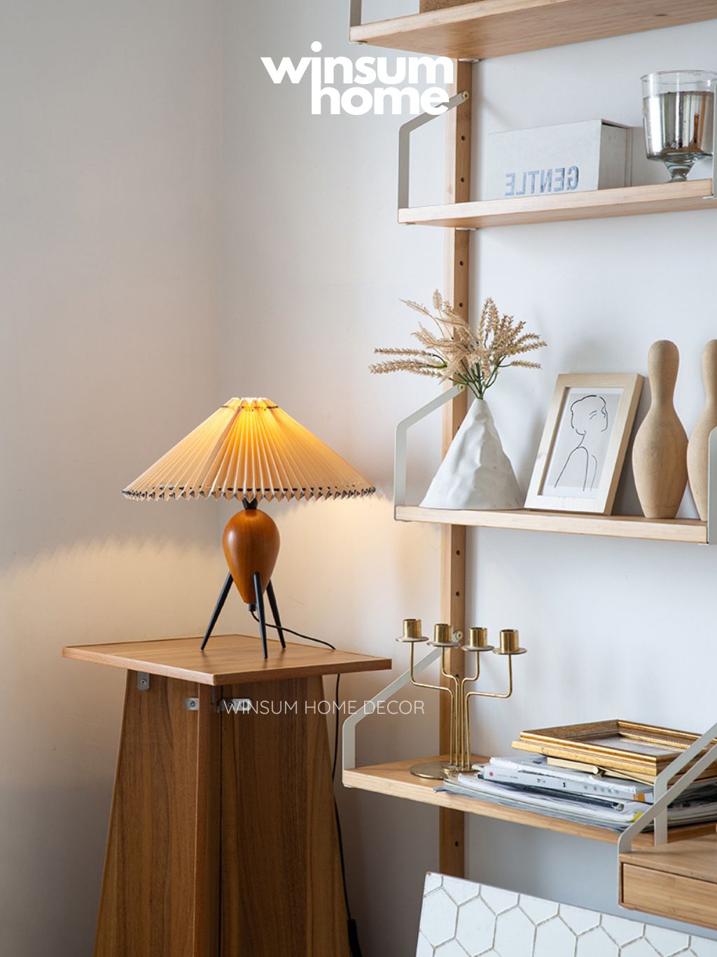 Ví dụ: Đèn có chân gỗ ba chân và chụp đèn bằng vải lanh màu be, mang lại sự ấm áp và gần gũi.