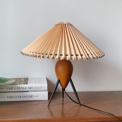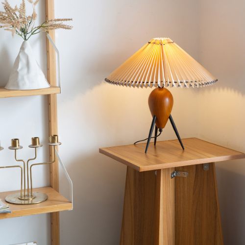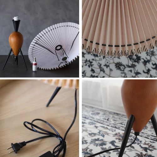 Thân đèn hình giọt nước bằng gỗ sáng màu, đặt trên ba chân kiềng (tripod) mảnh khảnh bằng kim loại đen. Sự kết hợp giữa gỗ tròn ấm áp và kim loại góc cạnh tạo nên sự cân bằng thị giác động.
