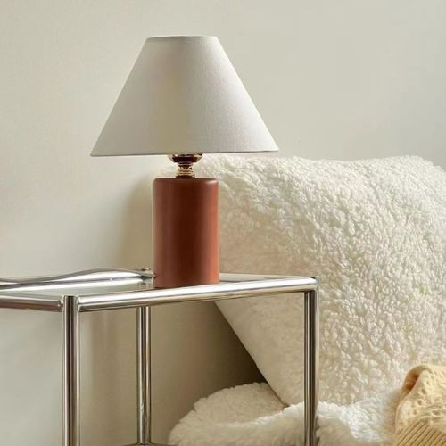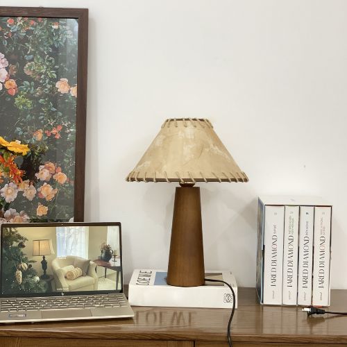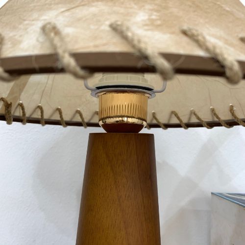 Chân đèn hình trụ tròn, được làm từ gỗ tối màu (có thể là gỗ óc chó hoặc gỗ cao su sơn màu đậm) tạo cảm giác chắc chắn, sang trọng. Sự tối giản của thân gỗ được cân bằng hoàn hảo bởi chao đèn hình nón truyền thống.