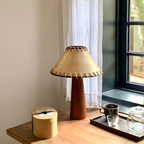 Điểm thu hút là chao đèn độc đáo, có vẻ được làm từ da lộn hoặc chất liệu da mỏng (suede/leather), với đường khâu thô mộc bao quanh viền. Ánh sáng vàng xuyên qua chao đèn này tạo nên màu sắc cổ điển, cực kỳ ấm áp và cá tính.
